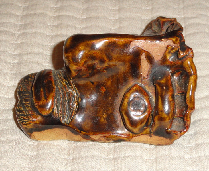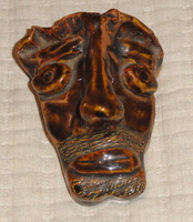 This 4" x 4.5" tall folk art stoneware sculpture of a bearded man is unsigned but attributed to one of the many late 20th C. face jug potters found throughout the Southern US. It has a nice brown glaze, applied soulful eyes and a scratch beard and mustache. It will sit flat on a table or can lean standing up on a shelf. An interesting piece that would add intrigue to any collection.