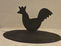 Circa 1800 _ 1850 Pennsylvania origin decorative pot lid has a Rooster shaped handle which is peened. The lids were made to cover jars of previously cooked foods. Rather than seal them with layers of lard or oil to preserve the food and keep insects and rodents out wrought iron lids were fashioned to cover the jars or pots. It measues 5 1/2 in. In diameter. The surface of these covers were chased with a design which adds to the decoation. These lids can be found in IRON AT WINTERTHUR by Donald L. FENNIMRE.