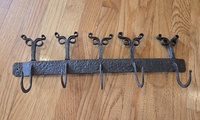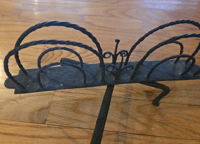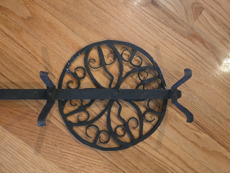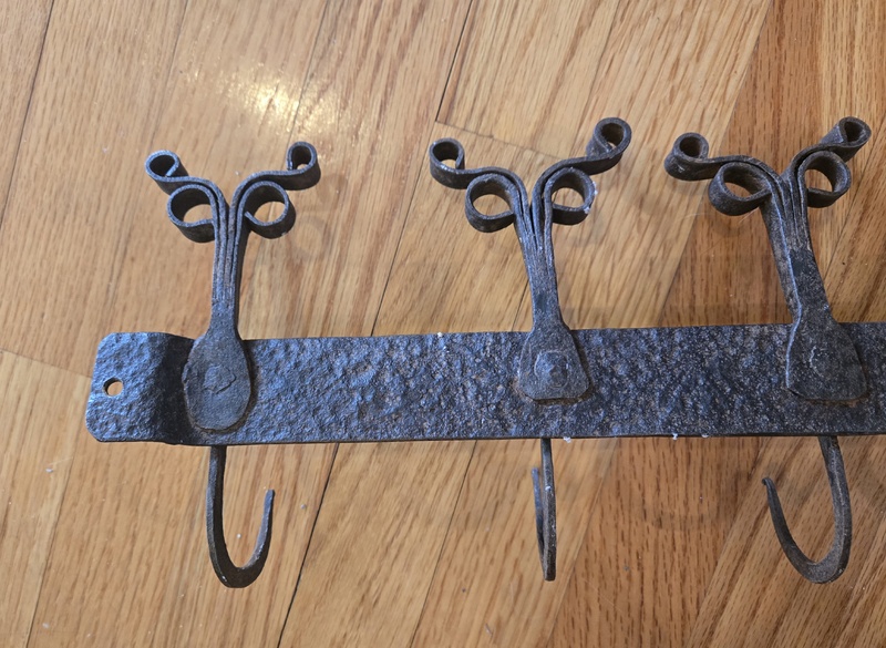 This heavy iron utensil rack is nearly 20 in. Long.and 6 inches from bottom of hood to top of decoration. It has 5 large hooks. This piece was purchased in PA. It is in the original finish and excellent condition.