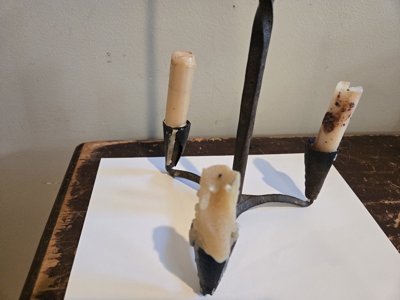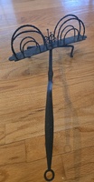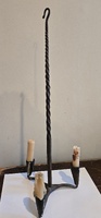 Wrought iron candle holder for 3 candles has a twisted design on the 19In. Iron hanger. The candle holders are 7 in. Apart. Nice old piece.