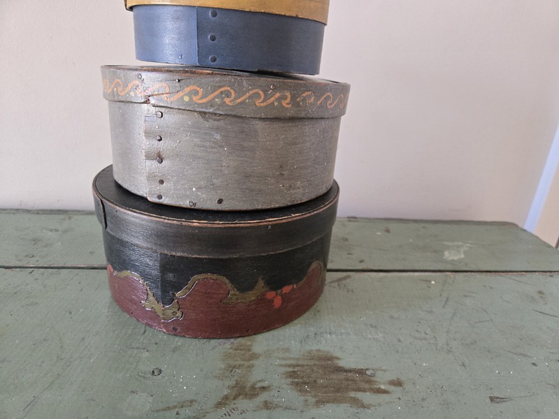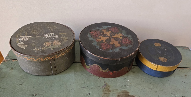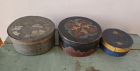 3 pantry boxes painted with a design. These are old boxes. All in good condition with tight sezms. The smallest 6 in. Diameter is blue with yellow band, the sage green 7 in. Also has yellow design with white And the largest 8 in. Black with red and gold trim. All in good used condition.