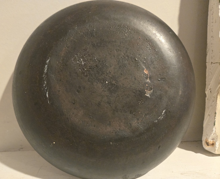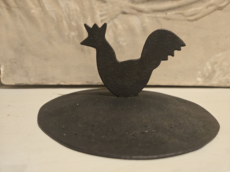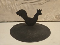 Measuring 5 1/4 in. In diameter and 2 1/2 in. high this early pot lid was made with a figural rooster peened through the center. In addition there is a decorative design all around the edges. Often these lids were made to cover the opening of pots or storage jars in order to prevent insects or rodents from invading the food. Examples. Are shown in the bood "IRON AT WINTERTHUR" by Donald Fennimore.