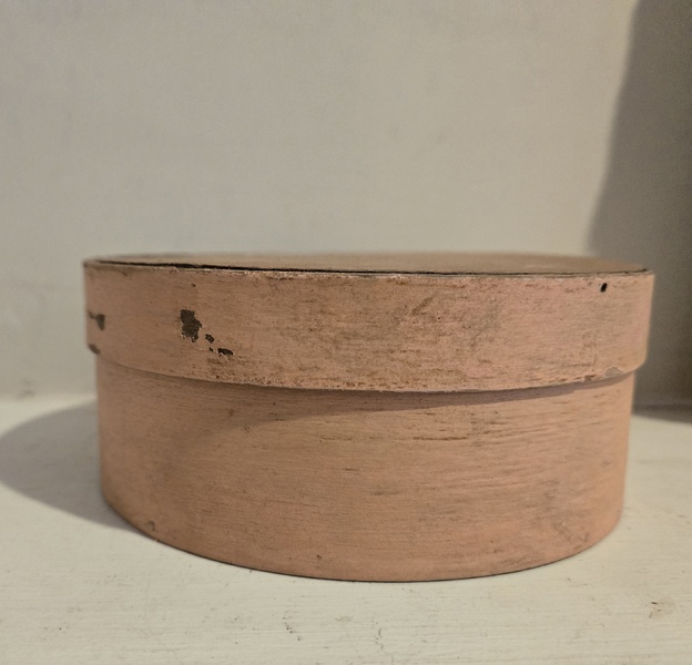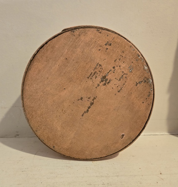 This painted pantry box is in old original yellow paint. It is 6 in. In diameter and 2 1/2 in tall. There is normal wear for an old box. Please check photos. Shipping $10.