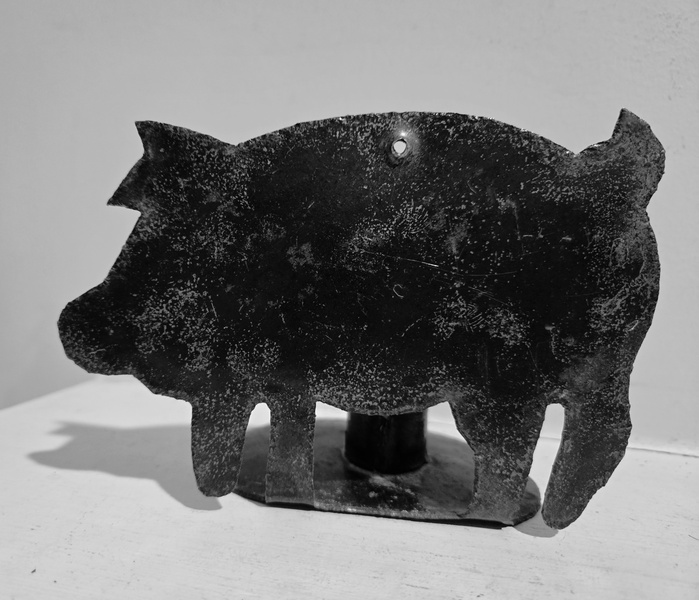 Standing 4 inches tall this little pig candle holder is 5 inches across. The pig and candle holder are made in one piece. Very unusual!