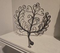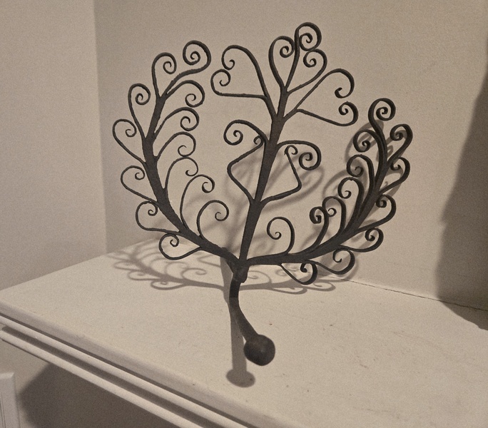 This lamp holder was popular from the late 17th c was used as a spike into a beam to hold a lamp usually a betty lamp. This particular beam spike is unusually large with hearts and flowers or fern. It is nearly 8 in. High and 9 1/2 in. At its widest point. The spike is 6 in Long and the unusually long lamp arm 5 1/2 in. Supported the grease lamp. As. Featured in Antique Country Furnishing by George Neuman.