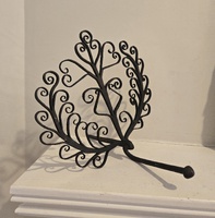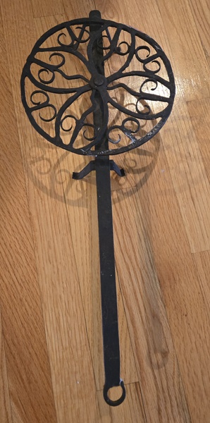 In the early days when no electricity toaster was available, homemaker used this type of rotating toaster. It was set near the coals and when one side was toasted it was rotated to toast the other side. This toaster has decorative features as the loops are twisted and there is a central decoration. It measures 17 in. Long and 13 in. Wide. Very good used condition.