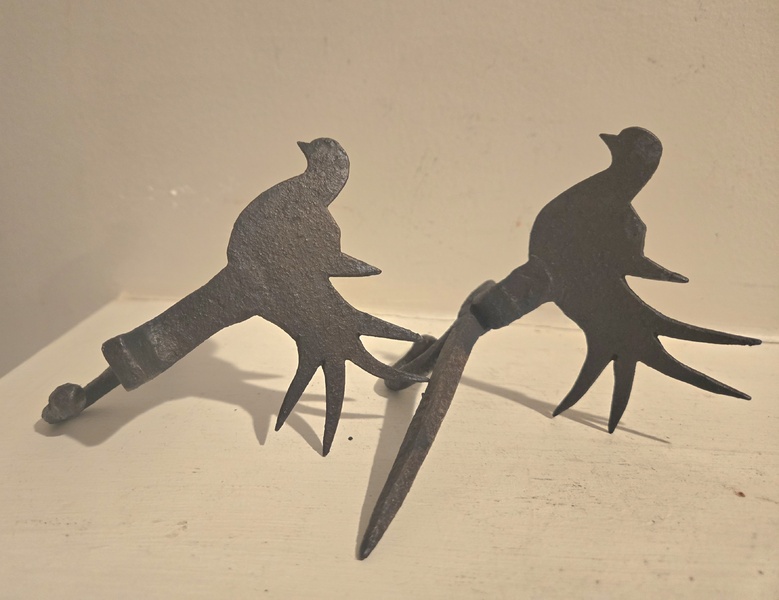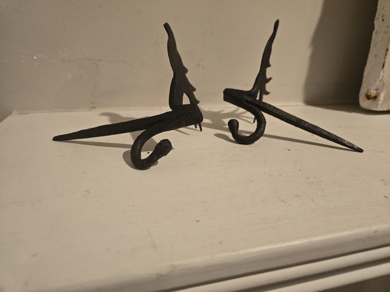 Here are two iron bird beam spikes designed during late 17th, early 18th c. To hold a grease lamp. The each measure 3 in High, not including the lamp holder, and 3 1/2 in wide. The beam spike, meant to put into a beam are 4 1/2in long. They are in great condition, ready to use.
