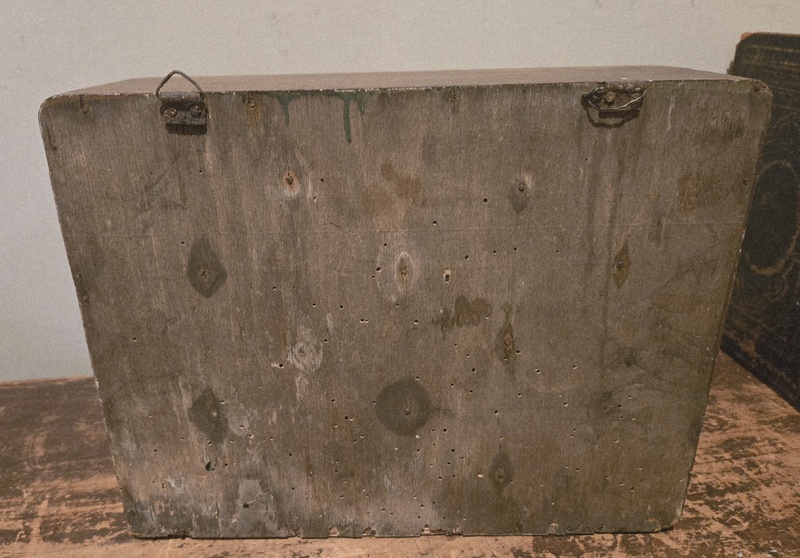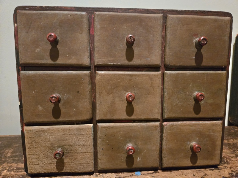 This 9 drawer dovetailed chest with a red wash has peg shaped pulls. The case and drawers are all dovetailed. It measures 11 inches across the top, 3 3/4 inches deep, and nearly 9 inches tall. A nice size to either sit on your kitchen counter or hung (with attached hangers) on your wall It is in good used condition.