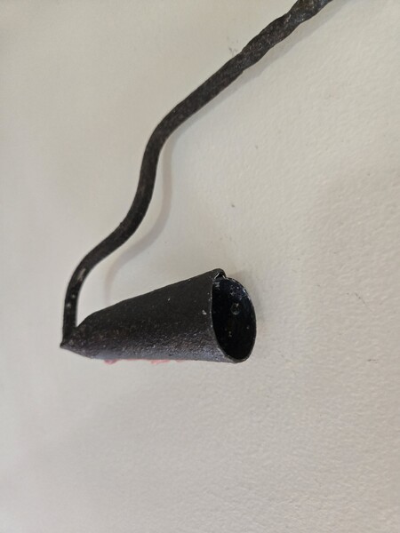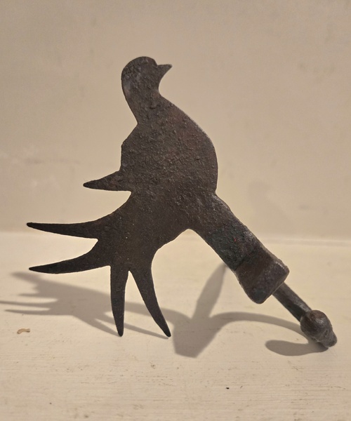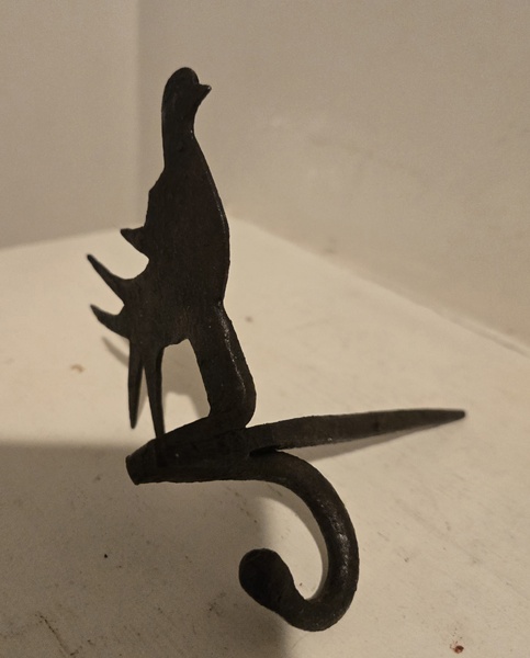This wrought iron beam spike is in the form of a bird. These are used to hang a betty lamp when not in use. The spike end was driven into the beam. It measures 4 1/2in in length and 41/2 in. High. Good condition.
