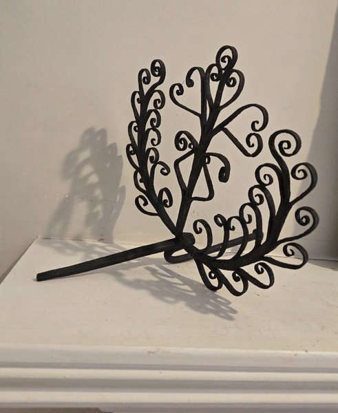 Large decorative beam spike used in 18th 19th c to hold a grease lamp. The spike is 6 in. Long, the hook that holds the lamp is approx. 5 in. Long. The metal is formed into hearts and fern. This is 8" tall and 9 1/2" wide. In excellent condition.