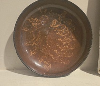 Nice old coggled edge plate or large bowl measuring 9 1/4" in diameter. It has yellow slip decoration throughout. It has a small chip on boggled edge. More photos available.