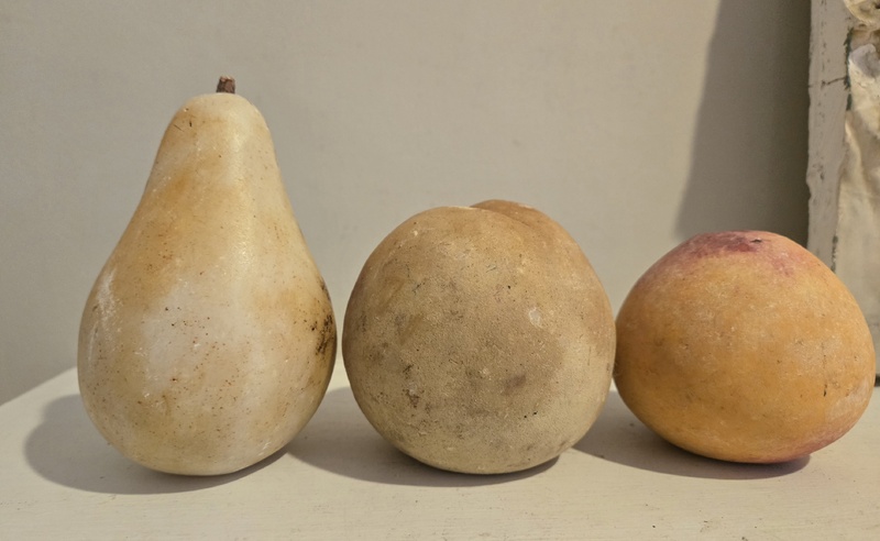 Three oversize antique stone fruit. The pear is nearly 5 in. Tall, the larger peach is 3 1/2 in. Tall with an 11 in. Circumference. The smaller peach is 2 1/2 in Tall with a 9 inch circumference. All are in great condition.