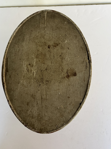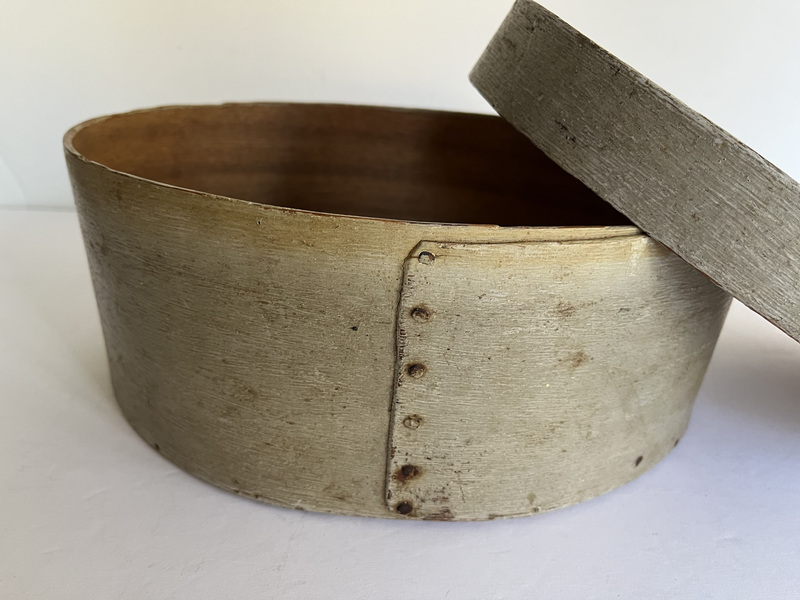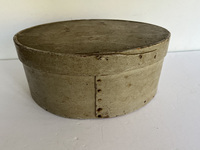 19th c. New England oval pantry box in original, early putty color paint. 10 1/2" x 7 1/2" x 5" tall. It has square nails and shows great wear! More photos available.