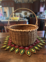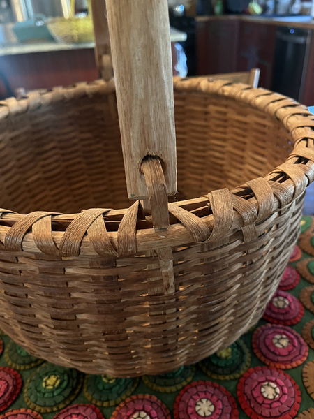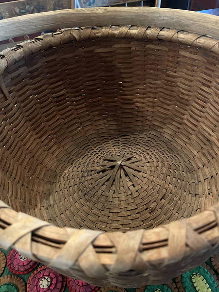 Large Taghkanic swing-handle basket in excellent condition! No breaks! All these baskets came from the Taghkanic region in the lower corner of Columbia County in New York State by a group of people sometimes called "Bushwackers." They were known for the outstanding quality of these baskets. It measures 15 1/2" wide by 8 1/2" tall, not including the handle.