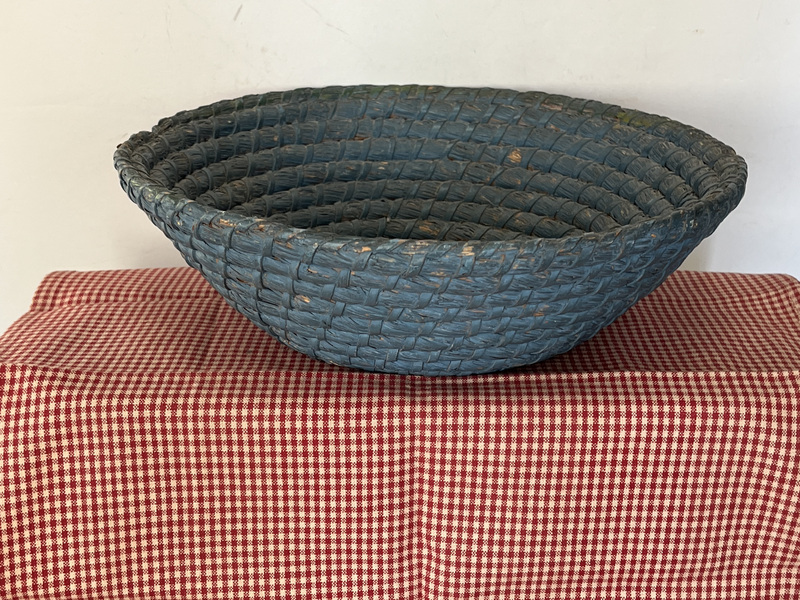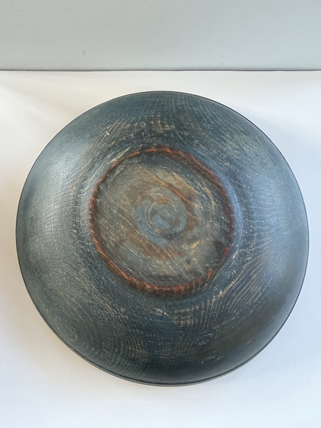 19th c. blue bowl with original old paint. There is a 1 1/4" rim and a raised foot. There is a darker area on the inside bowl which appears to be an old oil stain. 11" x 10 1/2" x 2 1/2" high, out of round.