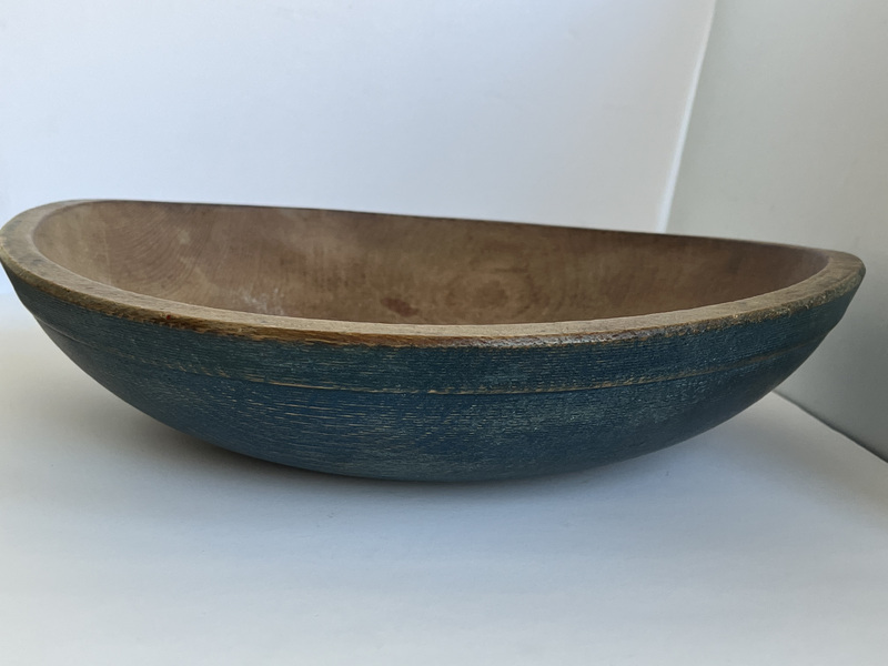 19th c blue painted bowl in original early paint with a small foot and a 3/4" rim. It measures 13" x 12 1/4" x 3" out of round. Beautiful blue!!