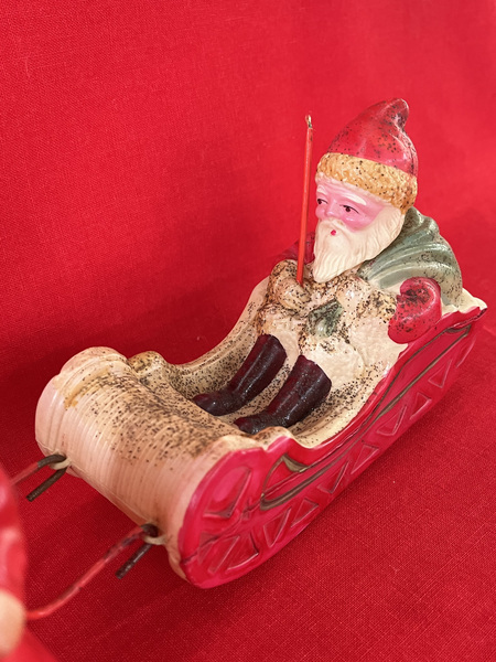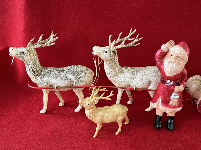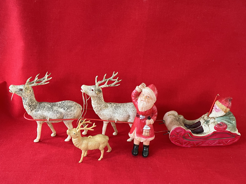 Here is an 18 inches long Santa in sleigh, being pulled by 2 reindeer. Also, a standing Santa, 5 1/2" tall, and a plastic reindeer, 3 1/2" long. All in very good condition.
