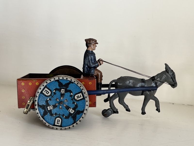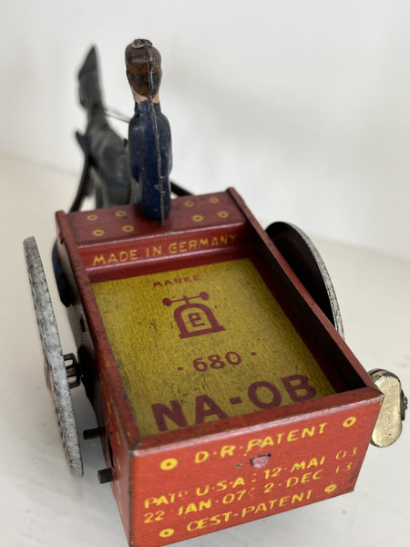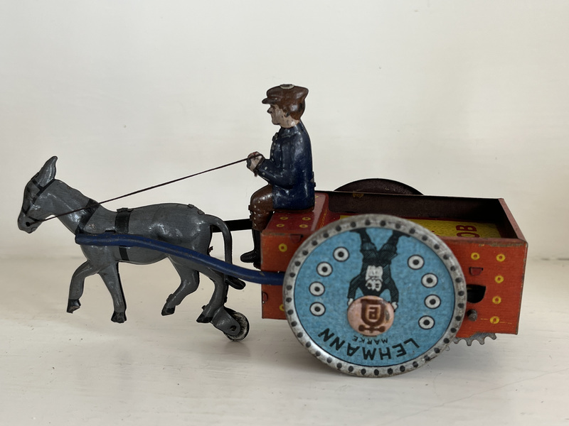 NA-OB tin wind-up toy of a donkey pulling a cart along with the driver. It was made by Lehman of Germany around 1900-1910. 6 inches long. It goes in circles on the floor when wound up. Very good condition.