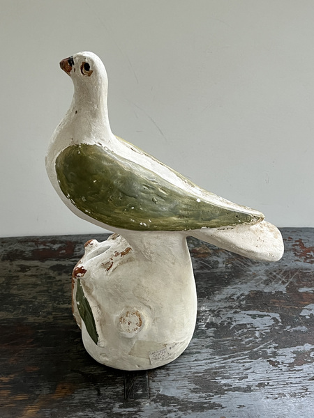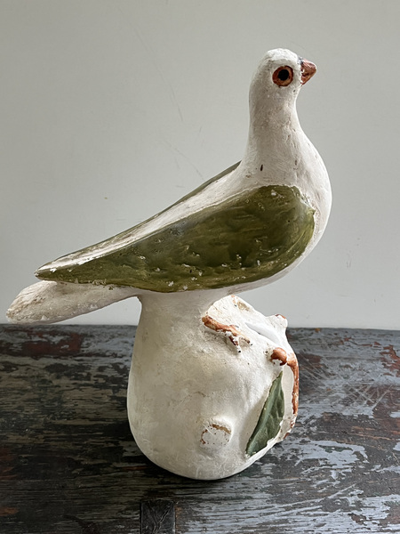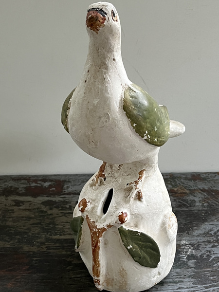 Here is a chalk ware dove bank, 11 1/2" tall made by David Ellinger ca. 1930. He was a famous theorem artist from Pennsylvania. He also was a personal friend of my aunt, Caroline Edleman, an antiques dealer, who owned the bank. It shows some wear, but no cracks.