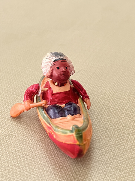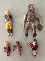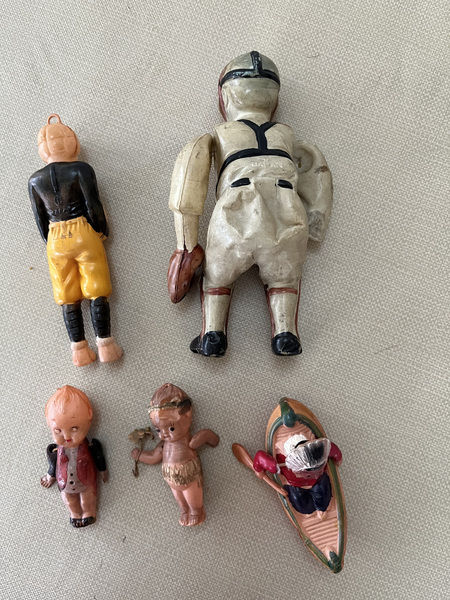 5 Celluloid people, including a football player, baseball catcher, a boy and girl, and a canoe with an Indian nodder. All are in good condition. The catcher has a back side which is a little dented. Catcher is 5 1/4" tall. Canoe is 2 7/8" long.
