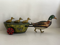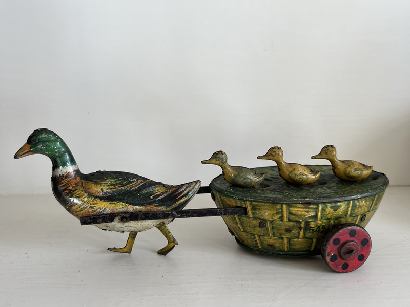 Paak Paak Quack Quack tin wind-up toy made by Lehman of Germany ca. 1903. When the key is wound and released the baby ducks move up and down. It is in very good condition. 7 1/2inches long.
