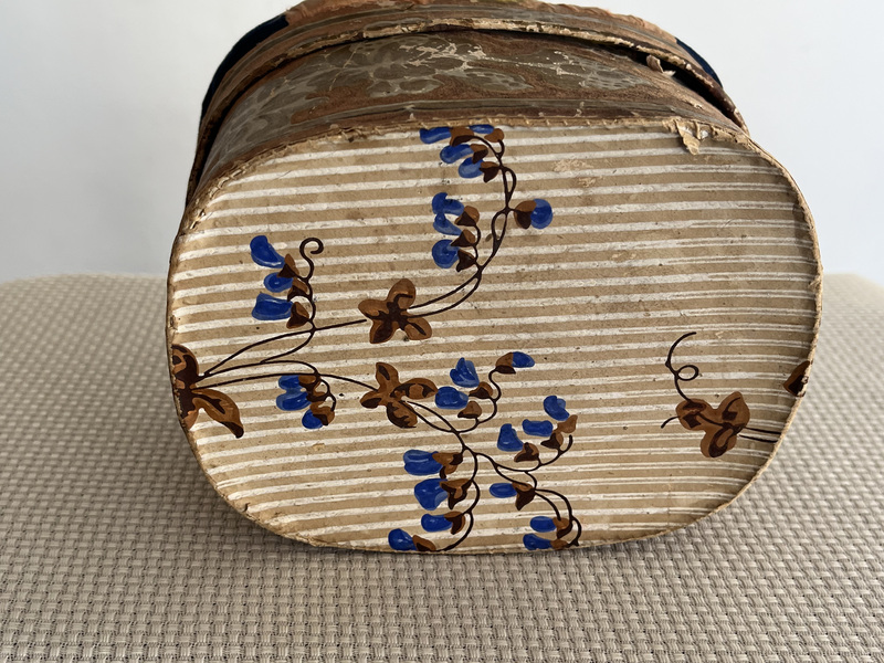 Here is a German or Pennsylvania- German lidded bentwood oval box. It is extensively decorated with flowers, blue leaves and accents on a brown ground. There is a tulip design on the top and all four sides. The top has a six-point star with flowers scattered about. 7" wide x 4" tall. A very nice box!