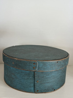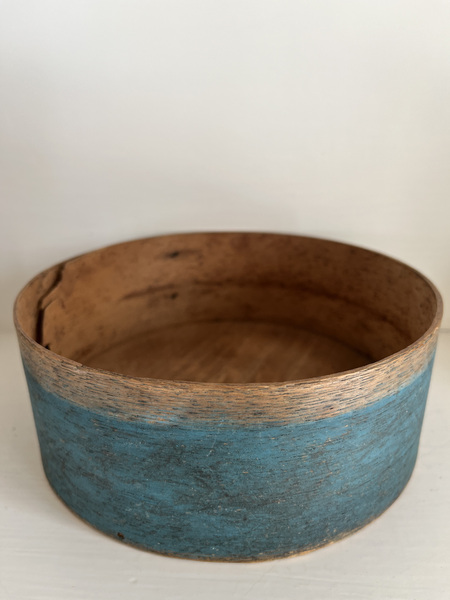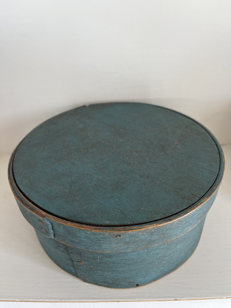Here is an early, 1870-1890, pantry box in early original blue milk paint. It has copper tacks and tiny nails and wooden pegs. There is a small split on the band around the top. 6 3/4" x 2 3/4". More photos available.
