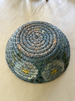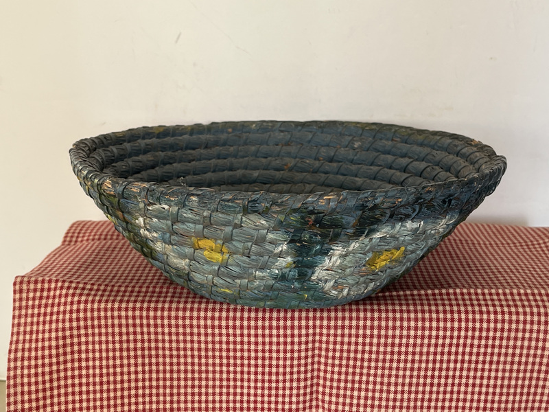 Early Rye Straw basket in original early blue paint. It has a white and yellow flower decoration painted on it. The paint is nice and dry, and the basket is very sturdy and firm. A rare find!