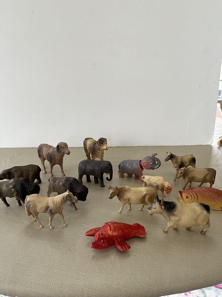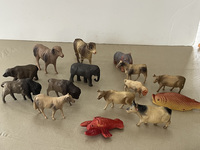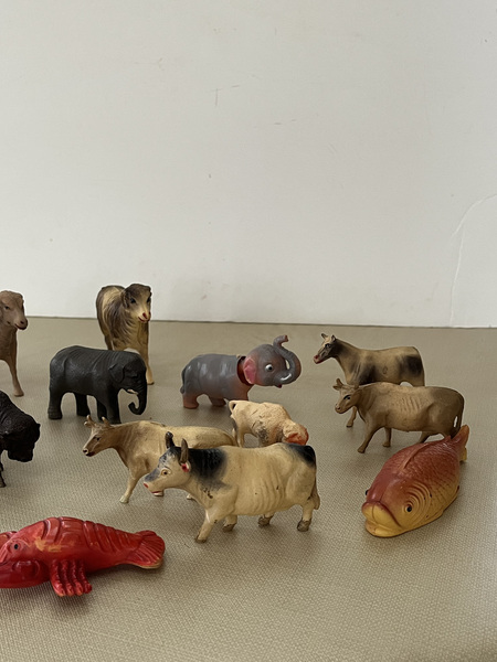 Here are 15 celluloid animals, including cows, sheep, 2 elephants, goat, buffalo, fish, and lobster. Very good condition with 2 small animals have a leg glued. One elephant is a nodder. Larger animals 4 1/2" long x 3 1/2" tall. Smaller ones 3" long x 2 1/2" tall. Fish is 4 1/2". Lobster is 3" long.