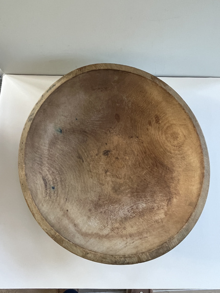 Early to mid 19th c. butterscotch bowl in original, early paint. There is a 1 inch rim. It shows wonderful wear from use. There are many cut marks inside the bowl. This is a beautiful, early painted bowl! No issues. 14 3/4" x 14 1/4" x 4 1/4" out of round.