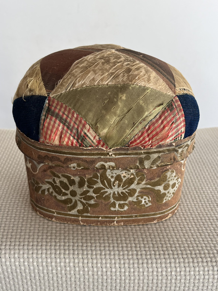 19th c. Quilted pincushion top wallpaper box with beautiful printed wallpaper with gold accents. The quilted top has some fragile areas. 5 1/2" x 4 1/2" x 5" tall.