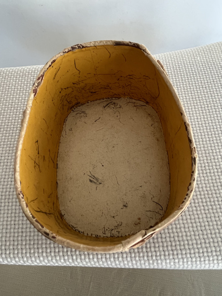 Vintage heart -shaped trinket basket. It has a lid which opens to reveal a wallpapered or painted interior. The bottom also has the same design. 7 1/2" x 6 3/4" x 3" tall.