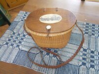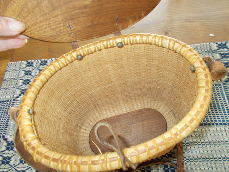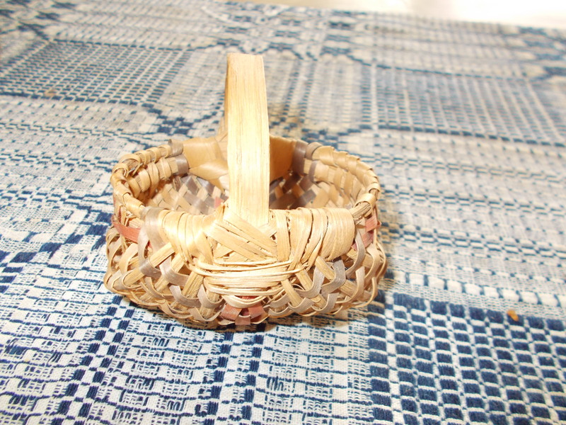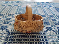 Offering a mini basket, nicely woven of spling with red and green weavers on the bottom. It measures 3" diameter x 2-1/2" to top of carved handle. Basket is darker than photo 2 and 3.