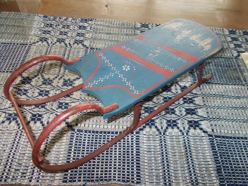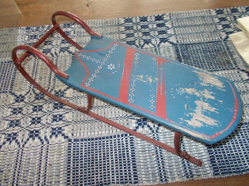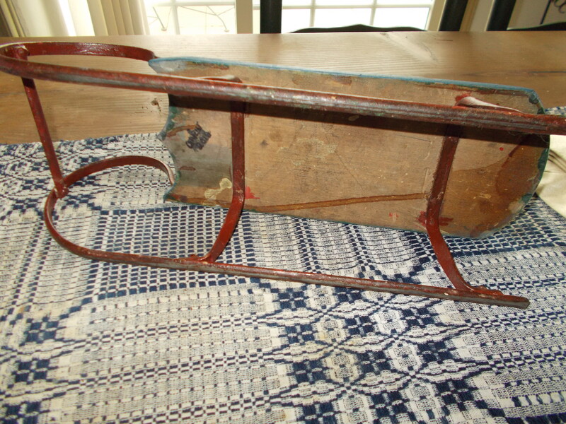 Offering an early mini sled in blue with red and white decoration and red runners. Some say a salesman's sample, some say they were sold for little girl's dolls. 5" wide x 15" long.