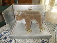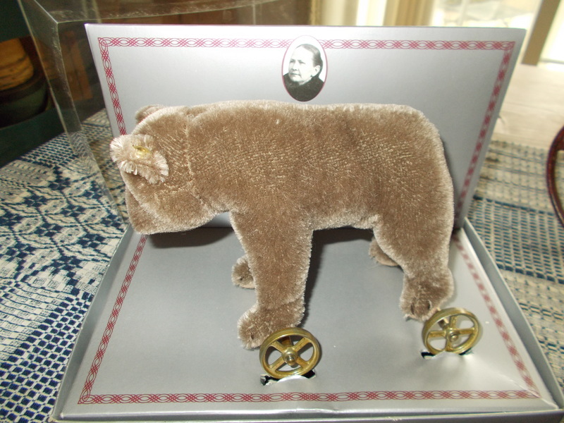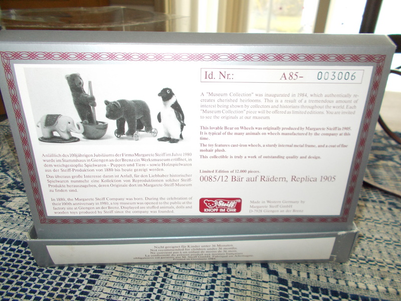 Offering a Steiff bear on wheels in original box. Numbered 3006 of 12,000 in 1994. Some wear on box; bear in excellent condition. Replica of 1905 bear.