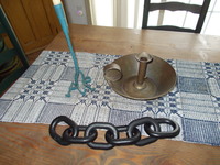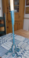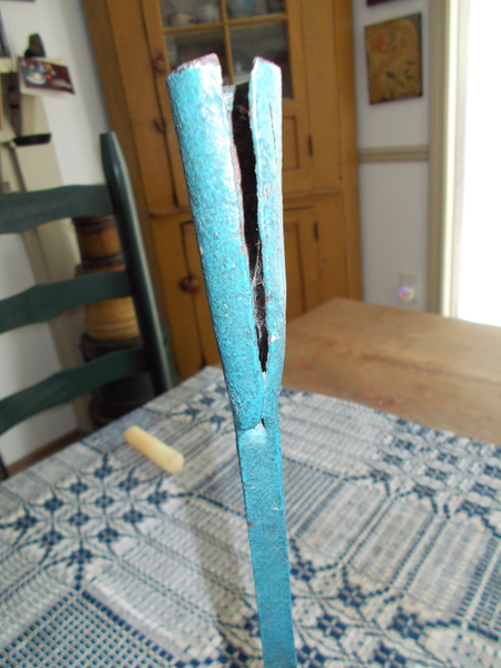 Offering an early branding iron with letters A R with handle used as a candle holder. Blue paint isn't as old as iron but pleasing. 13" tall.