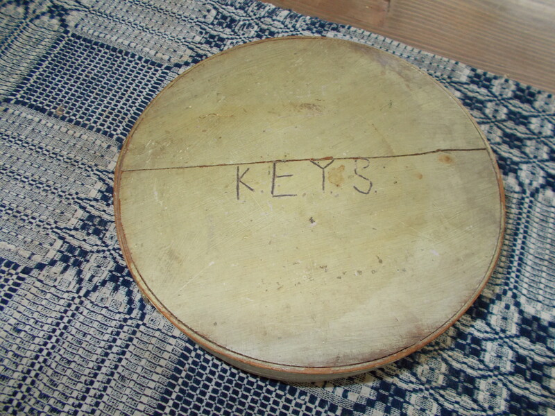 Offering an early pantry box measuring 8-1/2" x 3-1/2" tall. It is in light light mint green paint with KEYS carved on the top.
