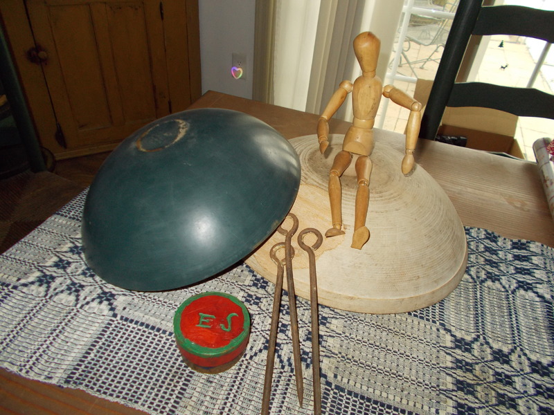 Two dough bowls, one blue and one white, little paint decorated pantry box, 3 iron skewers and wooden and jointed artist mannequin. All FREE SHIPPING.