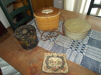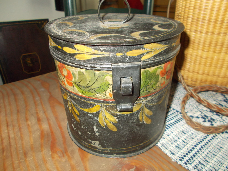 Beautiful toleware tea caddy, Nantucket basket purse, French embroidery purse and medium size painted pantry box for KEYS.