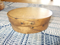 Offering an oval pantry perhaps SHAKER, measuring 5" X 3-1/2" 1-3/4" Tall.. Iron nailed fingers and wooden pegs. Great condition.