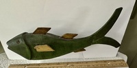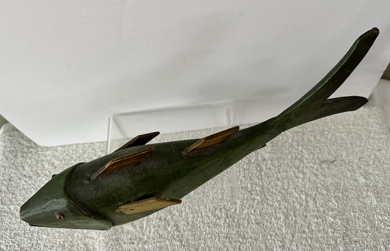 13” Carved Wooden Green Painted Fish This carved wooden green painted FISH has wonderful detail and an overall presence. No evidence that it ever was a fishing lure or decoy (no weights, no rig-lines, etc.), but it does have attached fins and gills and 2 glass eyes. Graceful form, it measures about 13” from mouth to tail and sitting on the table (flat bottom so it sits evenly) it is 5” to the top of the tail. The fins are metal and the body up to the tail is carved from one piece of wood. The tail is 2-piece construction. Something different to add to your decoy collection!