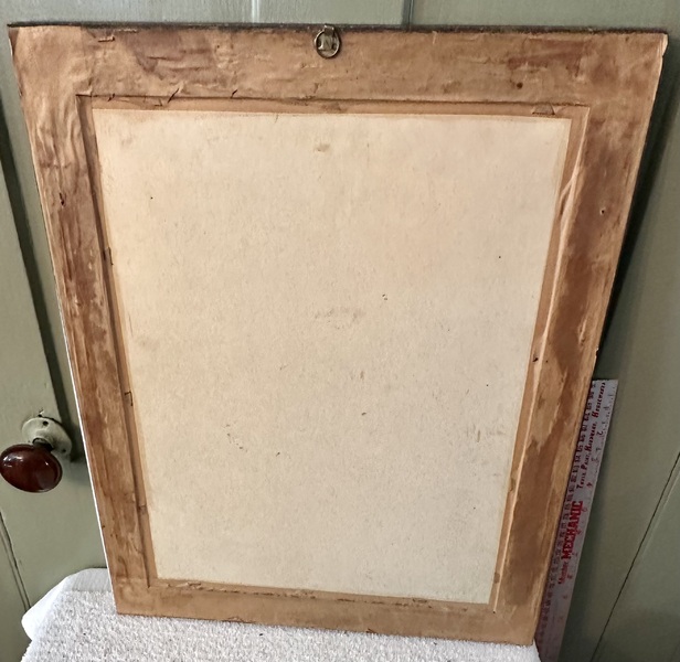 If you are looking for a great grain painted frame, here is one to consider. Red/Black painted mid-19th century frame in original surface. Frame is 16” x 12 ¼” and the sight size is 13 ¼” x 9 ¼”. Solid and well-put together, the frame has some edge bumps and some scattered scuffing, but the paint is strong. The glass is probably a replacement, but the 3 part backboard is probably original. You are buying the frame here; the Currier print, “Reading the Scriptures”, is just coming along for the ride. (The print is an “N Currier, 2 Spruce St. New York”).
