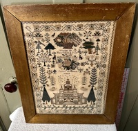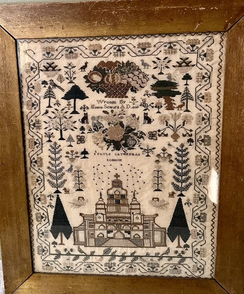 Emma Seward’s needlework sampler, dated 1833. This is an English sampler and it includes a image of St. Paul’s Cathedral in London, a basket of fruit, flowers, trees, small birds, angels, and a couple of black cats (just below the basket of fruit). It measures 12 1/8” x 16” and is framed in a wooden frame, making the overall size 16” x 20 ¼”. The needlework is in very fine condition: clean and crisp with no rips, spots, etc. and only a couple of tiny holes in the linen, not affecting any of the stitches. The wooden frame has some minor separation at the corners, but is solid. Not examined out of the frame.