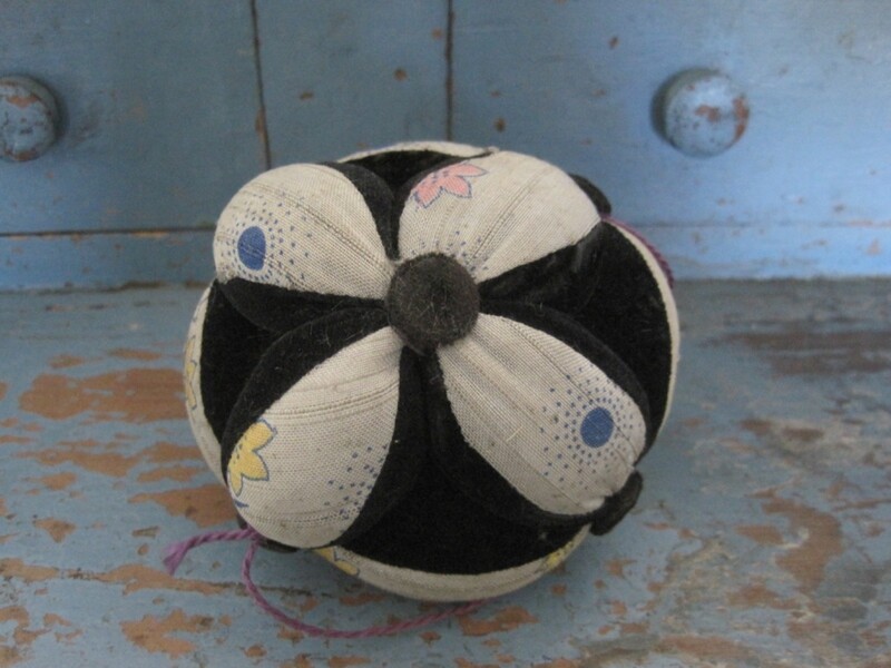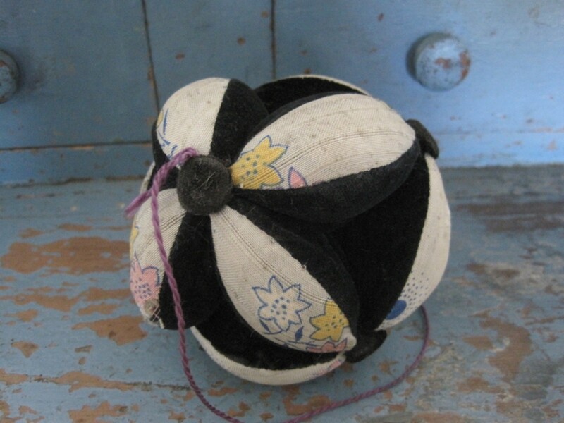 ANTIQUE, PENNSYLVANIA DUTCH AMISH, FABRIC PUZZLE BALL, VELVET AND CLOTH FABRIC, HANDMADE, WONDERFUL, PRIMITIVE AMERICAN COUNTRY FIND! I bought a very large collection of Pennsylvania and Ohio Amish, Dolls, Stuffed Toys, Long Stockings, Mittens, Pincushions, etc. Slowly I will be listing them on Ebay when I have time. APPROX: 4 1/8" with a height of 3 7/8" CONDITION: spots, fading, pinholes, along with wear and use that is expected with age