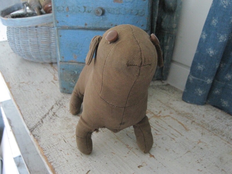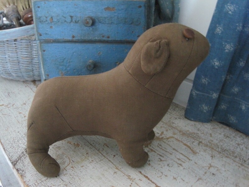 ANTIQUE, PENNSYLVANIA, BROWN FABRIC DOG, BROWN BUTTON EYES, FIRMLY STUFFED, FOLK ART HAND MADE, PRIMITIVE AMERICAN COUNTRY FIND! I bought a very large collection of Pennsylvania and Ohio Amish, Dolls, Stuffed Toys, Long Stockings, Mittens, Pincushions, etc. Slowly I will be listing them on Ebay when I have time. APPROX: length is 9"; head height is 6 1/2" and width is 4 1/4" CONDITION: spots, fading, hole, along with wear and use that is expected with age