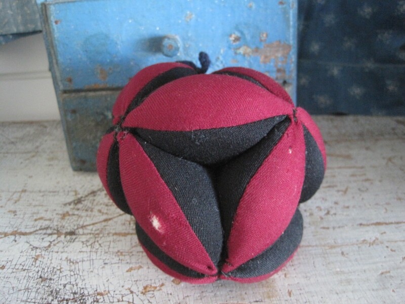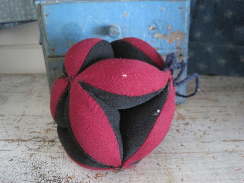 ANTIQUE, PENNSYLVANIA DUTCH AMISH, FABRIC PUZZLE BALL, FABRIC FEELS LIKE WOOL, HANDMADE, WONDERFUL, PRIMITIVE AMERICAN COUNTRY FIND! I bought a very large collection of Pennsylvania and Ohio Amish, Dolls, Stuffed Toys, Long Stockings, Mittens, Pincushions, etc. Slowly I will be listing them on Ebay when I have time. APPROX: 4 3/4" with a height of 4" CONDITION: spots, fading, pinholes, holes, along with wear and use that is expected with age