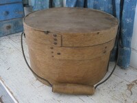 OLD, WONDERFUL, ORIGINAL PAINT WOOD FIRKIN WITH A BAIL HANDLE, GREAT SMALLER SIZE, ORIGINAL PRICE TAG WAS $350.00, PRIMITIVE AMERICAN FIND! This Old Original Paint Wood Firkin is Perfect for Display! APPROX: on the top side to side is 7 3/8"; on the bottom side to side is 8 3/8" and height is 8" CONDITION: scratches, stains, paint loss, along with wear and use as expected by age