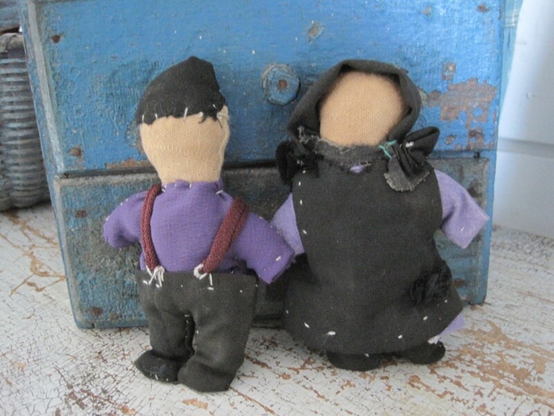 TWO VINTAGE, OHIO AMISH, LITTLE CLOTH CHURCH RAG DOLLS, BOY AND A GIRL, HAND MADE, PRIMITIVE AMERICAN COUNTRY FIND! I bought a very large collection of Pennsylvania and Ohio Amish, Dolls, Stuffed Toys, Long Stockings, Mittens, Pincushions, etc. Slowly I will be listing them on Ebay when I have time. APPROX: boy height is 4 1/4" and the girl's height is 4" CONDITION: spots, fading, along with wear and use that is expected with age