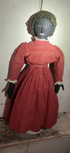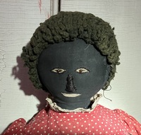 20" tall. Recently my husband suggested that I list some extra-special pieces here on DIG and I realize that, in my desire to list things at very competitive prices, I am creating a pattern. We all know that finding great things is not a budget game. So....here is a very special black doll, purchased from a Vermont collection. Her face is beautifully embroidered with small hazel glass pins for eyes, looped woolen hair, all original clothing with an exceptional red polka-dotted cotton dress, and really wonderful, original worn velvet shoes. She has some discreet sewn repairs on her "lobster claw" hands, but, overall, she is without apologies and truly a fine doll. c 1890. 2 photos.