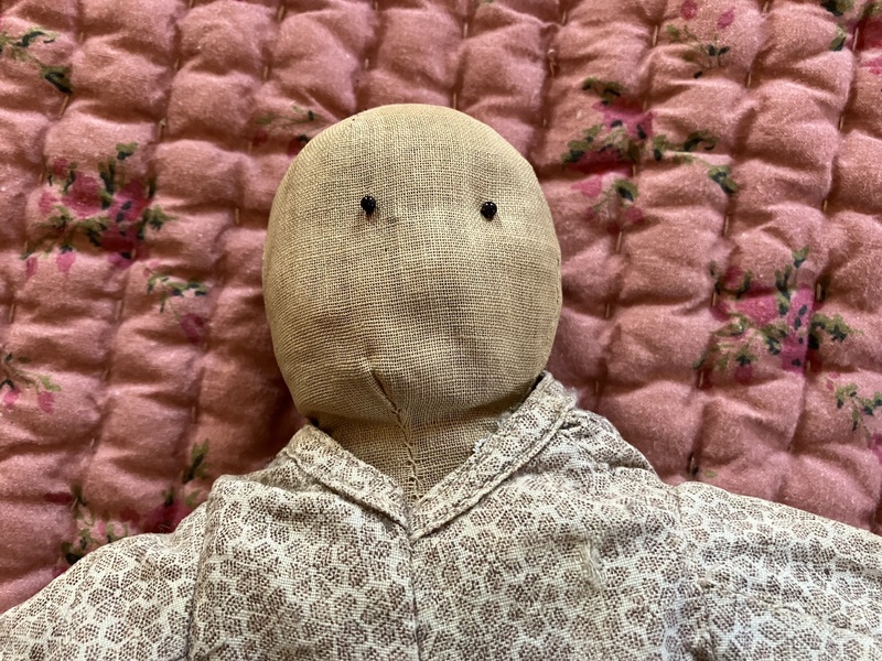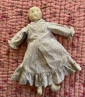 Late 19th century, wearing a very sweet, period, sprigged calico dress with nice details (ruffled sleeves and hem) , petticoat and chemise, with tiny black beads on old pins for eyes. She is loosely stuffed and shows overall wear, and a tiny hole on one lower leg. 2 photos.